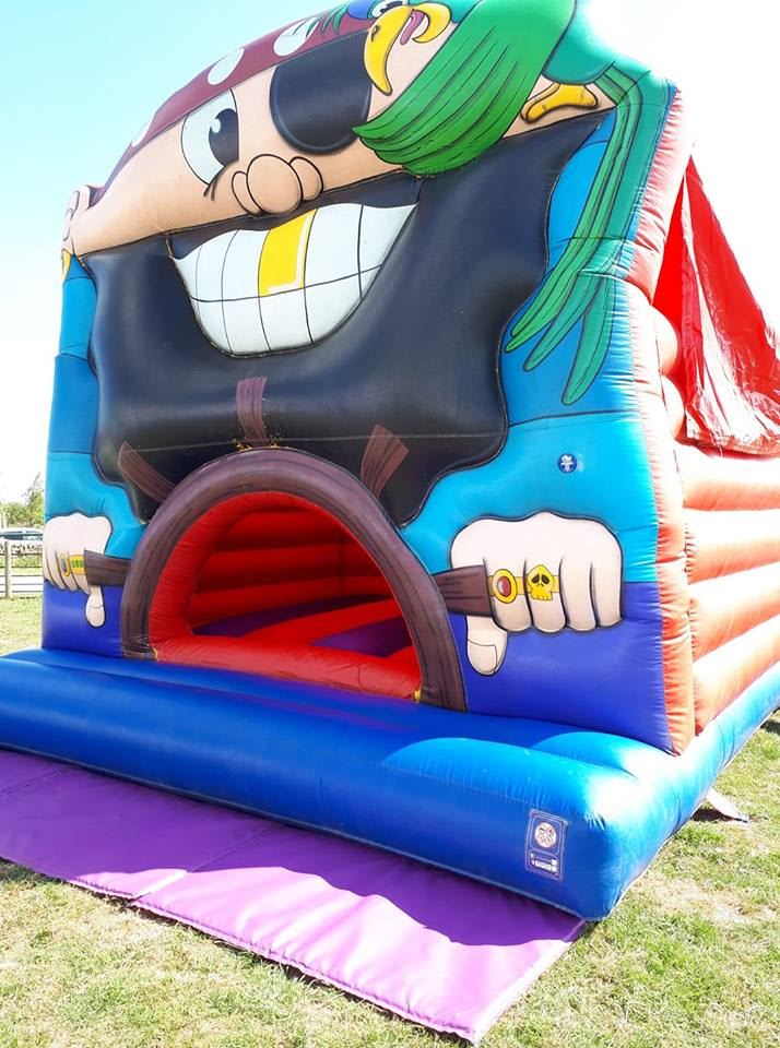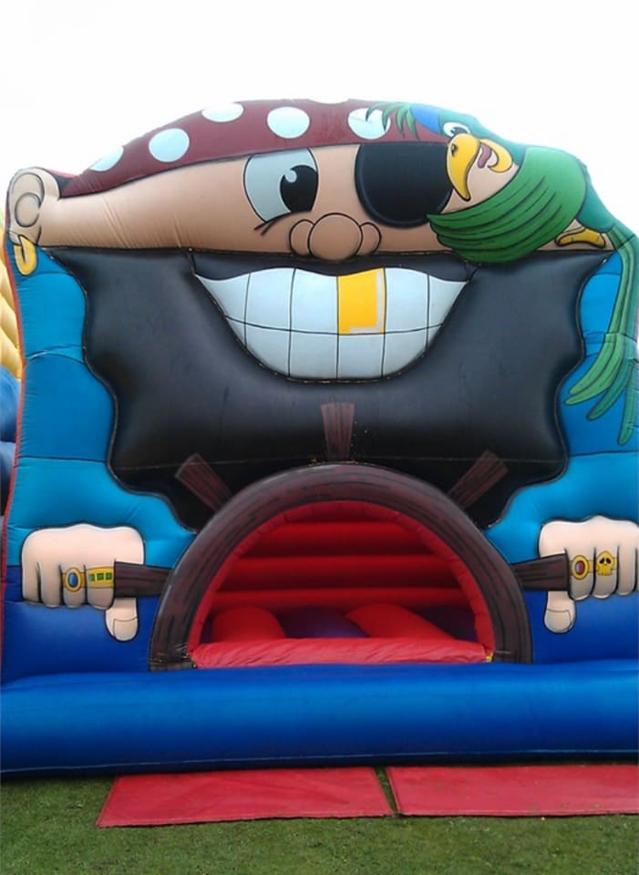 is very popular at children and adult parties - birthdays, fun days and occasions of any kind. With reinforced seams and a larger bouncing area it is suitable for up to 4 adults at a time. The front panel features a large image of a jolly Pirate.